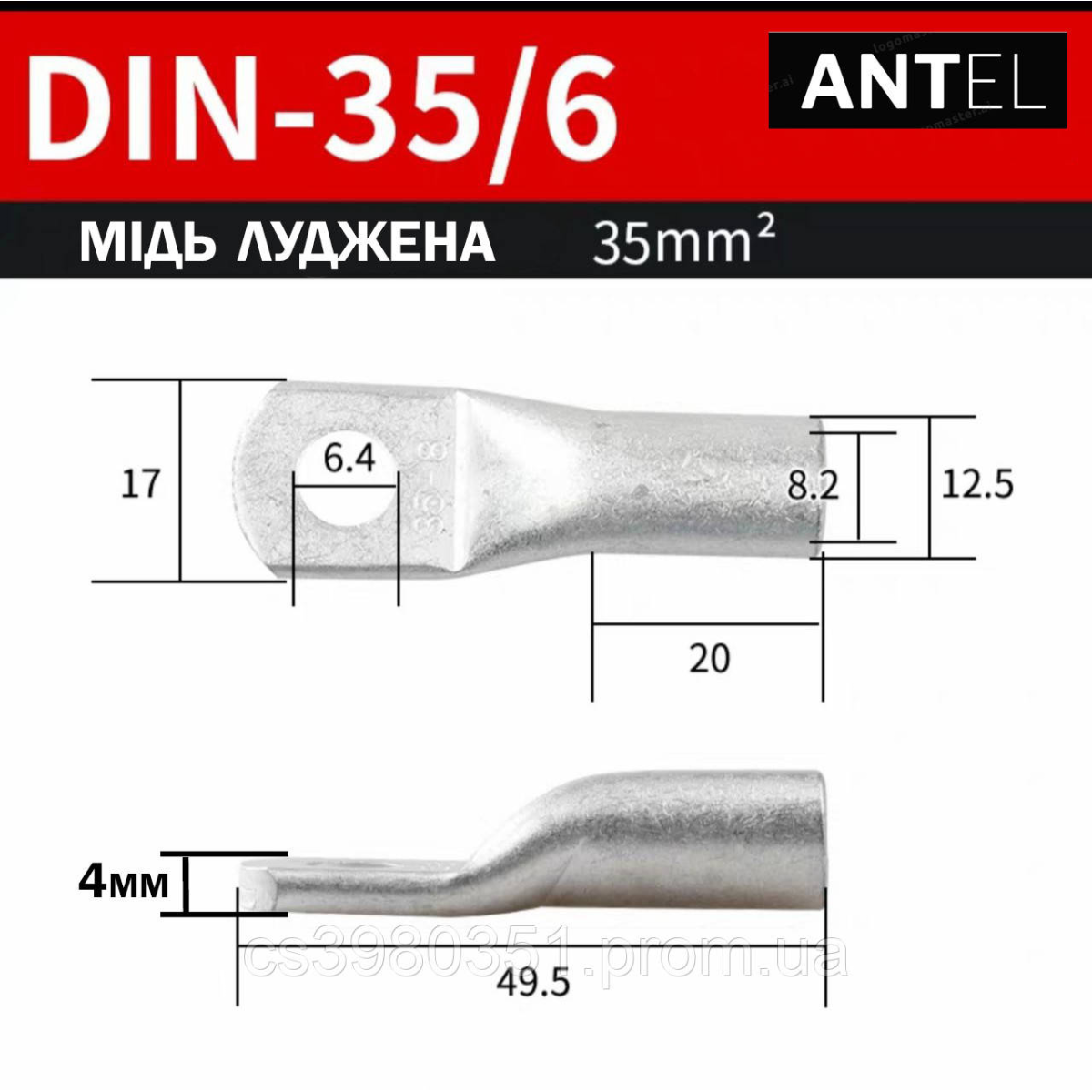Призначені для забезпечення надійного контакту при окінцюванні мідних та алюмінієвих проводів методом опресування. Опресований наконечник після опресування фіксують на клемних колодках чи шинах. Довжина: 49.5мм Матеріал: Лужена мідь Перетин провідника: 35мм2 Діаметр зовнішній: 12.5мм Отвір під болт: 6.4мм Ширина клеями: 17мм Товщина клеми: 4мм Довжина гільзи: 22мм Діаметр внутрішній: 8.2мм
