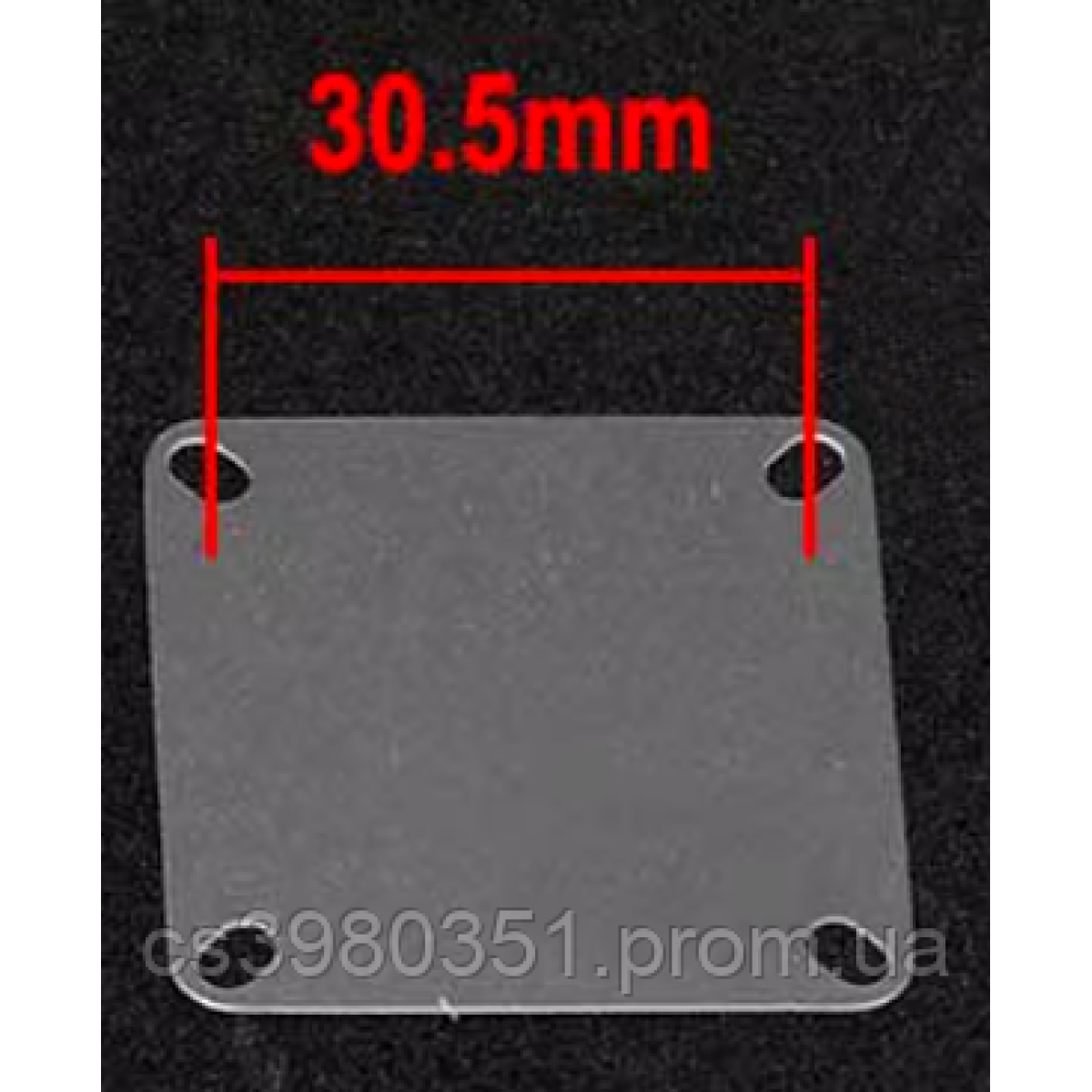 Розмір: 36*36 мм Товщина: 0,5 мм Відстань між отворами: 30,5 мм*30,5 мм Вага: 0,7 г Колір: прозорий